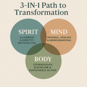 The 3-IN-1 Path to Transformation™ is a faith-based, holistic coaching methodology designed to bring total restoration by aligning the Spirit, Mind, and Body. True transformation does not happen in isolation—it occurs when all three dimensions of a person are healed, renewed, and brought into divine order.